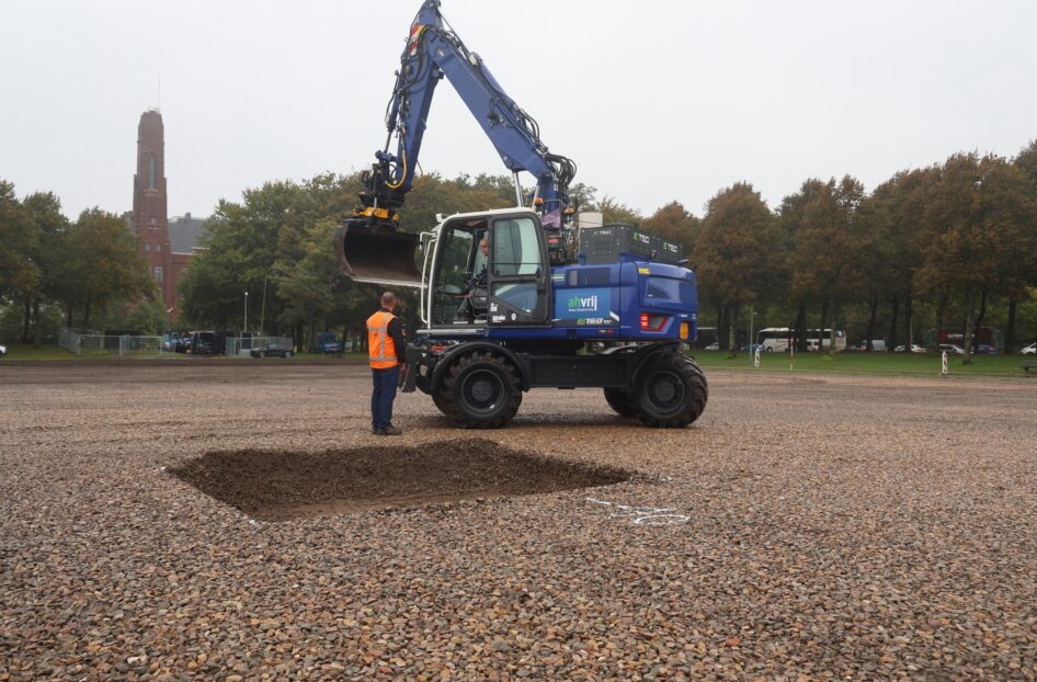 Projectleider Harm Eindhoven vult aan: ‘Halverwege september hebben we de toplaag van zes centimeter grond afgegraven en die tijdelijk opgeslagen in een depot. Daarna herprofileren we de grauwacke, zodat de tent veilig kan worden opgebouwd.’