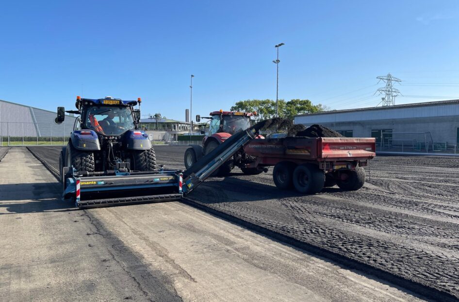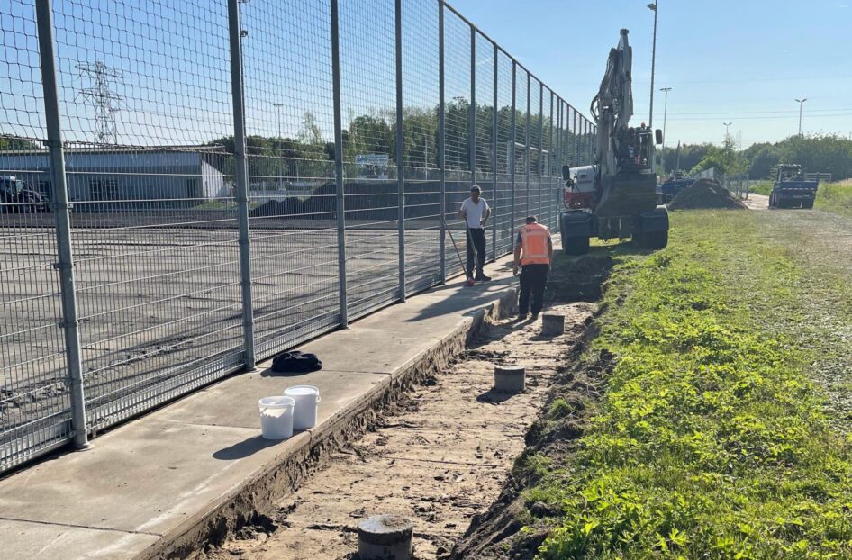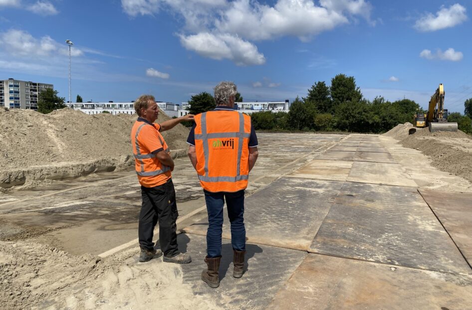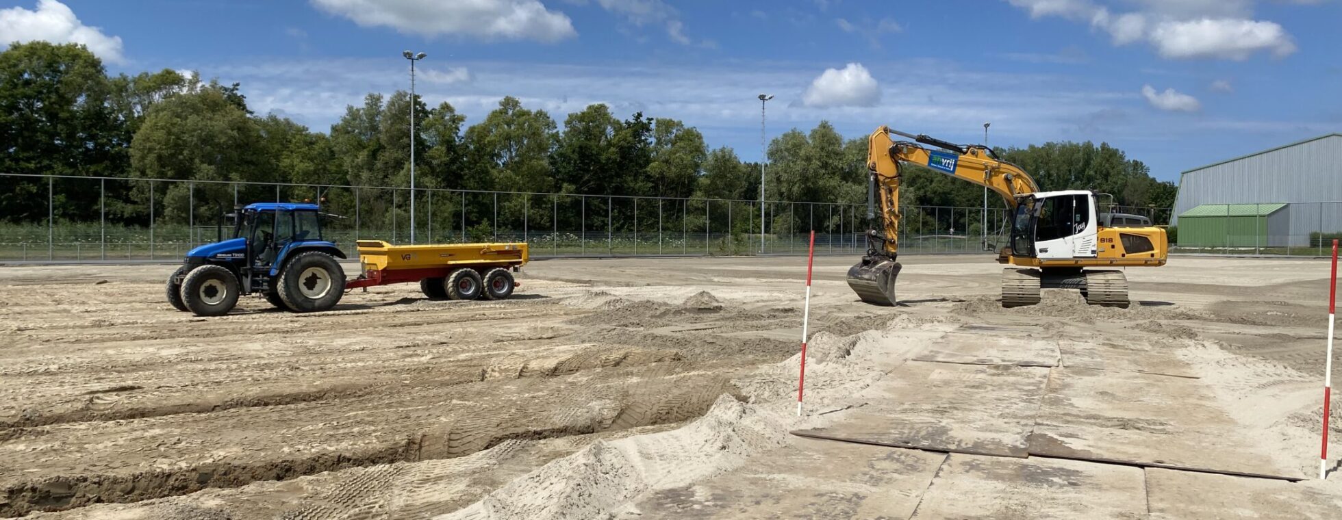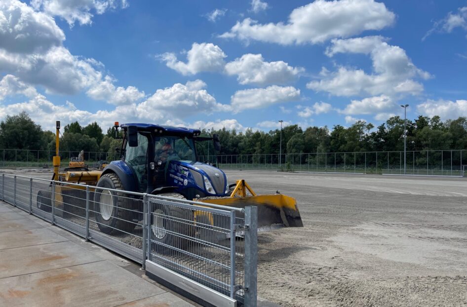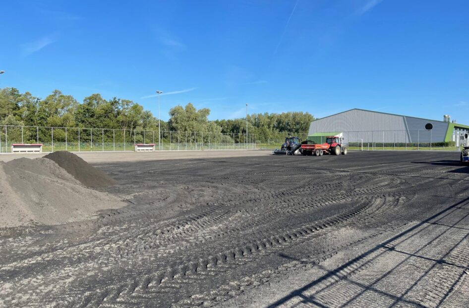 Bij AH Vrij Groen, Grond en Infra beschikken we niet alleen over de kennis en kunde voor de aanleg van de nieuwe kunstgrasvelden, maar zijn we ook in het bezit van de BRL 7000 certificering. Dit maakt dat wij naast het vervangen van de kunstgrasvelden ook de saneringswerkzaamheden uit konden en mochten voeren. Half juni werd gestart met de werkzaamheden. Na het verwijderen van de hekwerken, het kunstgras met SBR-infill en de sporttechnische laag, kon de verontreinigde zandonderbouw, laag voor laag worden afgegraven en afgevoerd. Ook groenstroken werden tegelijkertijd afgegraven. Dit alles gebeurde uiteraard onder nauw toezicht van de milieukundig begeleider.
